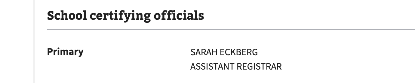 To find the SCO’s name at the university that you want to attend, find the university in the search bar of the GI Bill Comparison Tool, click onto the university’s page, and scroll all the way to the bottom of the school page (see image above.)